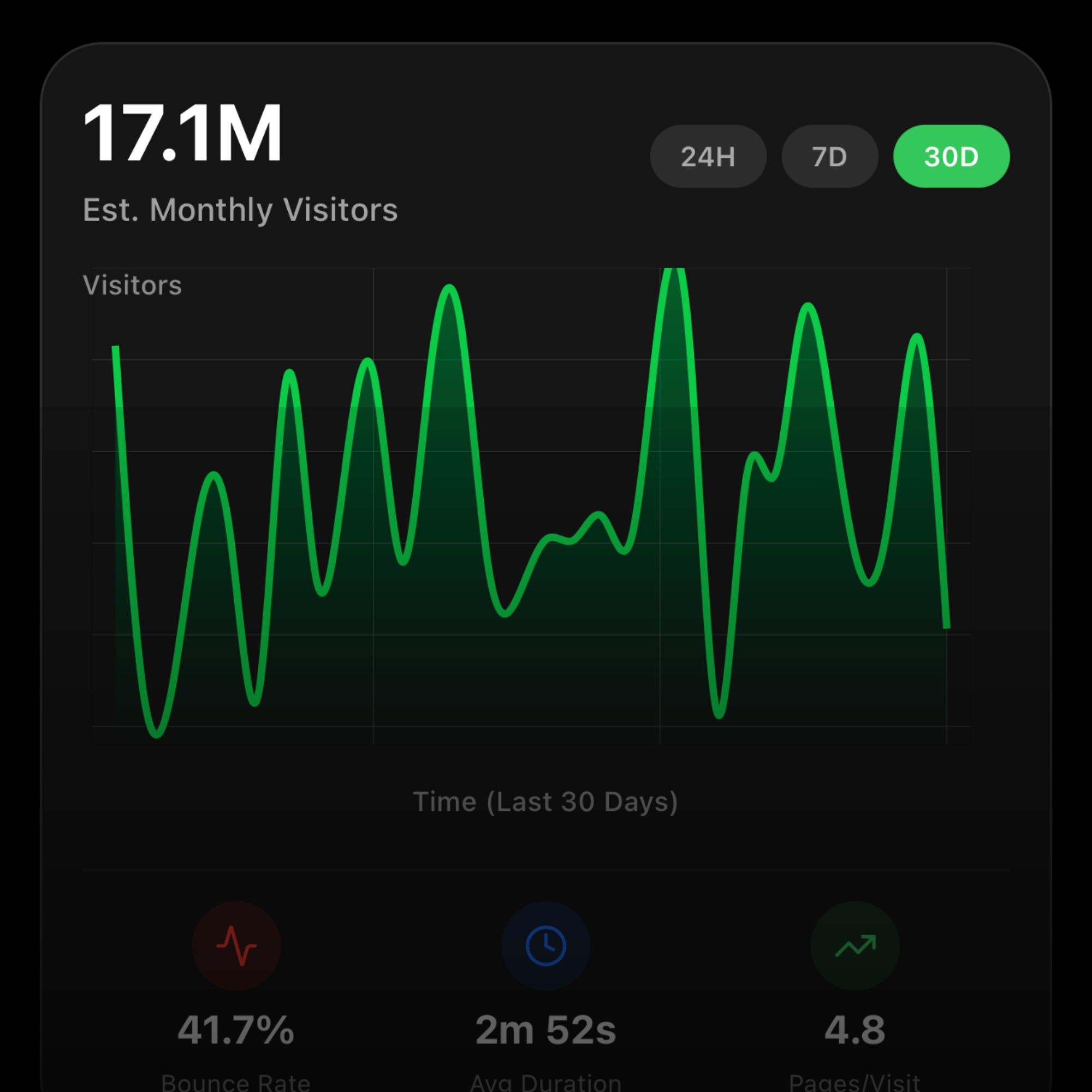 Analyze monthly visitors, bounce rate, session duration, and pages per visit at a glance.